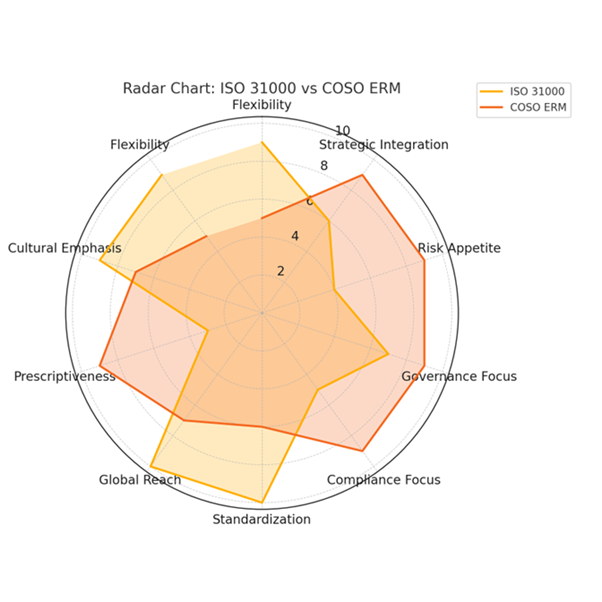 ISO 31000: High-level and principle-based; must be tailored to each organization’s internal and external context. COSO ERM: More structured, with component-based implementation tools and clearer execution guidance.