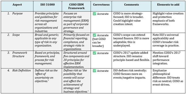1. What stood out most to you in this comparison between ISO 31000 and COSO ERM?Were there any insights that confirmed or challenged your current practices?