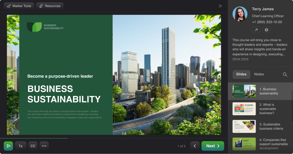 Luckily, pre-made color schemes, templates, fonts, and preset themes help the design process greatly. It’s also possible to save your favorite color combination or preset for further use, without needing to search for it manually each time. In iSpring Suite Max, there are many such presets, and you can apply them to any number of slides automatically. This will be great for supporting your brand identity throughout the eLearning program.